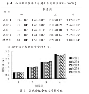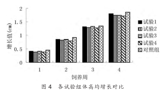 各试验组生长情况略有不同,以增重情况、体长增长量、 全长增长量及体高增长量等几个指标来比较,各组生长性能如下:对照组>试验 1>试验 3>试验 2>试验 4。