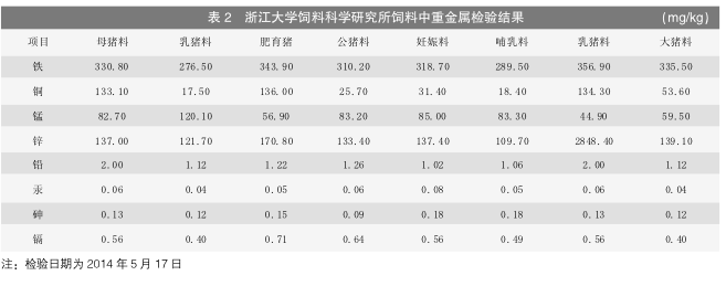 浙江大学饲料科学研究所检测重金属的结果见表 2,其检验结论为:从抽取的 8 个样品 8 个指标看,大部分合格或在检验误差值内,部分超标。