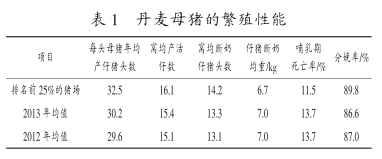 由表 1 可知,丹麦养猪场的母猪年均产仔数为 30 头, 而排名前 25%的养猪场的母猪年均产仔数达到 32.5 头。 基因遗传学的进步,使得母猪的窝产仔数年均提高约 0.3 头,母猪的平均窝产活仔数约 15.4 头,平均窝断奶活仔数约 13.1 头,仔猪平均死亡率为 13.7%,但数据显示,排名前 25%的养猪场的管理水平较高,其仔猪实际死亡率要低得多。 除了窝产仔数多外,分娩率高对于母猪的繁殖性能也极其重要, 丹麦养猪场的母猪平均分娩率为 87%,而在排名前 25%的养猪场中,分娩率则高达 90%。