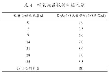 理想情况下,饲喂量应随着母猪产奶量的增加而增加。因此,母猪分娩时饲喂 3 个饲料单位/d;在哺乳第 1 周内,饲喂量逐渐增加至 5 ~6 个饲料单位/d;从哺乳期的第 2 周开始,母猪应执行自由采食,但饲喂量应逐渐升高。母猪哺乳期的饲喂量目标是 180 个饲料单位/d, 最好是 200个饲料单位/d, 因为这会使母猪在哺乳期的失重得到限制。 表 4 提供了母猪哺乳期饲料摄取量的下限值。