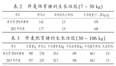 在丹麦,仔猪断奶日龄为 26 ~ 27 d,断奶体重约为 7 kg。 由表 2 和表 3 可知,保育仔猪(7 ~30 kg)的日增重约 450 g,排名前 25%的养猪场则能达到 480 g。 活体重为 30 ~ 106 kg 的肥育猪的日增重约 900 g, 料肉比为 2.67, 瘦肉率达到60.2%;另外在排名前 25%的养猪场能够实现更低的死亡率、更好的日增重和饲料报酬。
