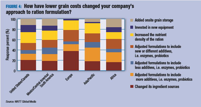 虽然当前粮食的价格下降,但是全球粮食市场的波动对全球家禽饲料的生产商来说仍然十分重要。粮食成本的降低促使许多公司重新审视他们的饲料配方。受访者表示,他们已经改变了饲料成分的来源并增加了饲料的营养密度(图4)。