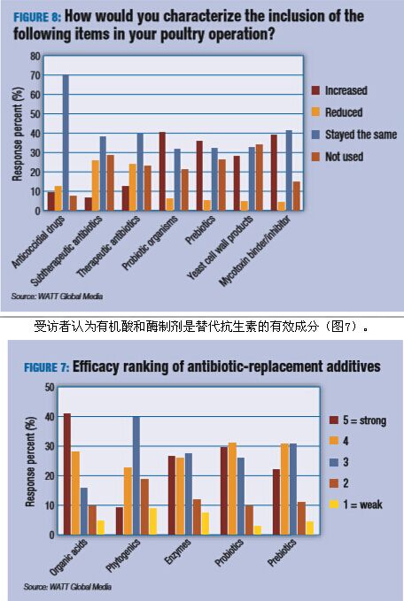 倡导消除饲料中不受欢迎的添加剂成为一种流行趋势,这一点不足为奇。总体而言,受访者表示不使用或者减少使用低剂量抗生素以及医疗抗生素(图8)。