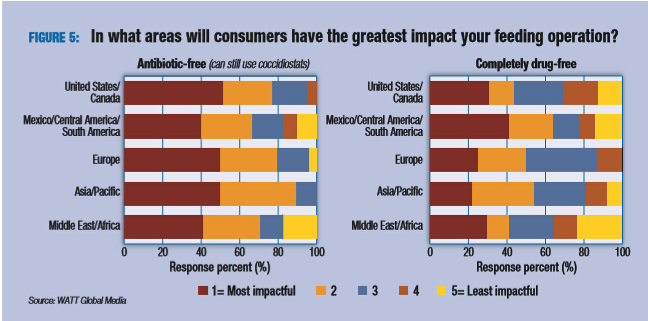 消费者的认知和态度使家禽饲料配方出现了一些变化。虽然非转基因和有机产品在一些地区排名很高,而“无抗”和“无药物添加”对饲料公司的发展所致的影响势不可挡(图5)。