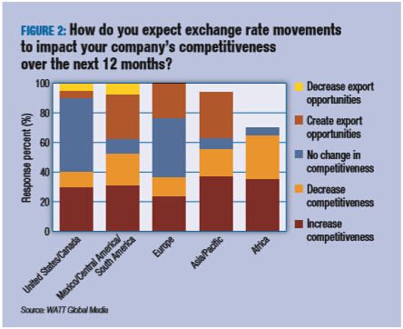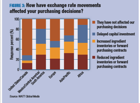 在多数地区,比如美国,汇率的变化不会影响消费者的购买决策,也不会促使他们增加饲料原料的库存量。然而,许多的受访者(主要来自拉丁美洲)表示他们将减少饲料原料的购入和期货合同的量(图3),同时也将延缓资本的投资。