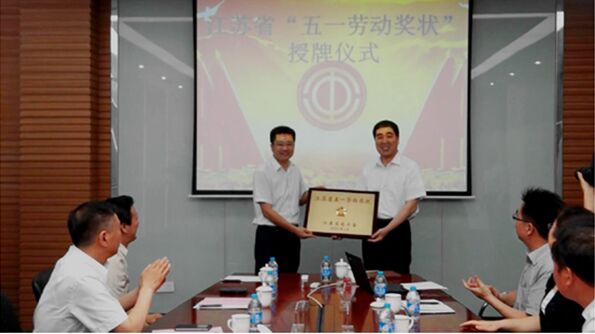 在授牌仪式上,张主席一行首先听取了近年来公司工会工作报告。陈云用图文并茂的方式,向张主席一行汇报了公司的概况和近年来的工会工作和成效,得到领导们的一致认可和赞扬。接着,杨翠娥副部长宣读了“关于表彰江苏省五一劳动奖状的决定”,并由张主席亲自授牌给公司李董事长。