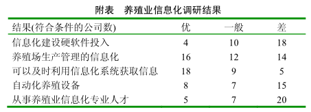 近年来,我国养殖业发展迅速,养殖方式正由粗放式经营向集约化、标准化、规模化方向发展,现代养殖业管理也在向精准化、自动化、智能化、网络化方向发展。为进一步了解国内养殖业信息化的基本情况,笔者进行了养殖业信息化调研,以便了解养殖业信息化的发展现状,调研的单位包括现代牧业有限公司、江苏立华牧业有限公司、山东得益乳业有限公司等。调研的主要内容包括公司信息化建设硬件和软件投入,养殖业生产管理的信息化,能否及时利用信息化系统获取信息,自动化养殖设备的使用以及从事养殖业信息化的专业人才储备。调研结果见附表: