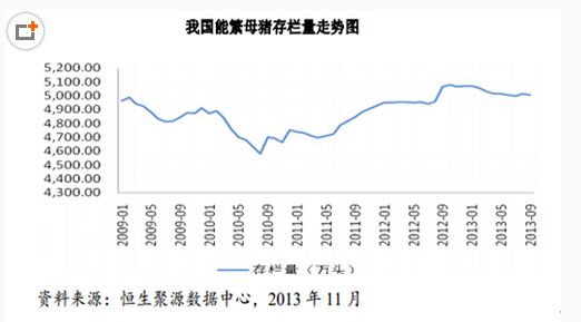 2009年1月至2013年9月,我国能繁母猪月存栏量波动较大。截至2013年9月,我国能繁母猪存栏量为5,007.00万头;2009年1月至2013年9月,能繁母猪存栏量占生猪存栏量的比例保持在10.25%-11.49%之间。