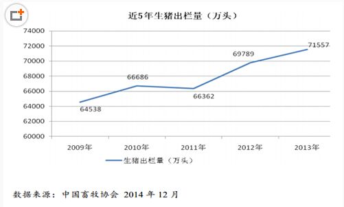 2009年到2013年五年中,猪肉平均消费增长率为3.28%,消费呈缓慢增长之势。同时,从2009年到2013年五年各主要肉类产量占比中可看出,猪肉占比一直维持在63%左右,居民猪肉消费结构稳定