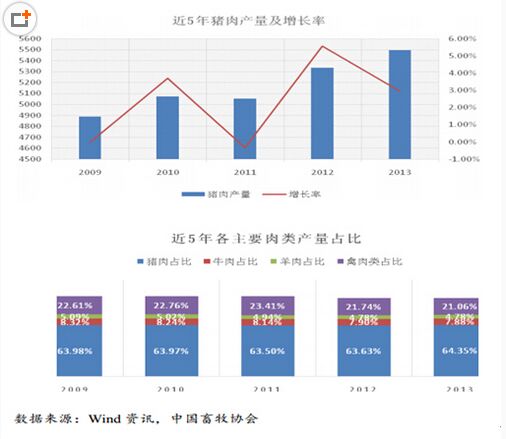 2009年到2013年五年中,猪肉平均消费增长率为3.28%,消费呈缓慢增长之势。同时,从2009年到2013年五年各主要肉类产量占比中可看出,猪肉占比一直维持在63%左右,居民猪肉消费结构稳定1 2009年到2013年五年中,猪肉平均消费增长率为3.28%,消费呈缓慢增长之势。同时,从2009年到2013年五年各主要肉类产量占比中可看出,猪肉占比一直维持在63%左右,居民猪肉消费结构稳定