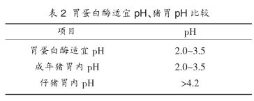 早期断奶仔猪的消化系统和免疫器官发育不完善,导致消化道中酶和胃酸分泌不足,并且由于从母乳为主突然改变到以采食固态饲料后,会引起胃内 pH 值的大幅度升高。 当加入酸化剂后降低了饲料的等酸力,相应胃内 pH 值下降,从而进一步提高胃蛋白酶的活性,提高饲料的消化率。 成年猪一般能保证胃内正常的酸性环境。 仔猪则会因特有的生理缺陷, 消化系统发育不成熟,胃酸分泌严重不足,导致其胃内 pH 远高于胃蛋白酶发挥活性的适宜 pH(见表 2)。 因此,仔猪胃内蛋白酶活性不能完全发挥,对蛋白饲料消化率降低, 会造成仔猪腹泻等一系列消化性疾病。同时肠道内容物的酸度也会影响胰蛋白酶、羧肽酶、淀粉酶、脂肪酶、麦芽糖酶、糜蛋白酶和乳糖酶的分泌和活性。
