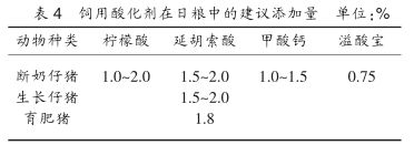 使用酸化剂的种类和添加量不一致,缺乏一个添加标准,添加少了作用不明显,添加多了有可能发生代谢性酸中毒。 因此,国内外学者对酸化剂在禽类生产中提出了一个建议添加量(见表4)。在实际生产中,由于不同种类生产对象及不同的生产环境的影响,酸化剂的添加量可能有所增减。