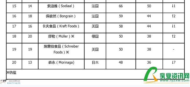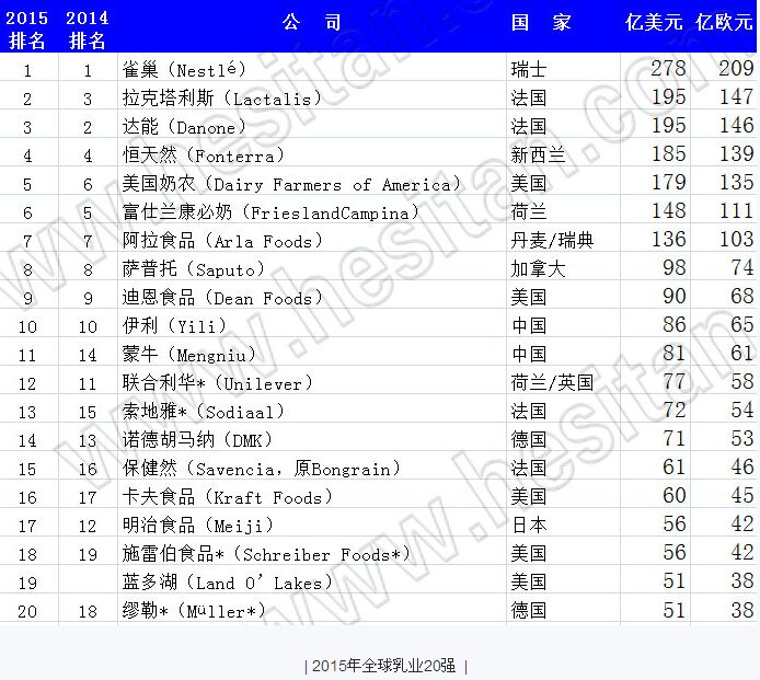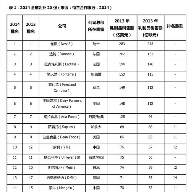 榜单显示,与2014年全球乳业20强比较,雀巢保持第一不变;达能下滑一位,法国拉克塔利斯上升一位,双方互换位置;恒天然继续保持第四位;美国奶农上升一位,菲仕兰下降一位,双方互换位置;其他7-10名位置不变。