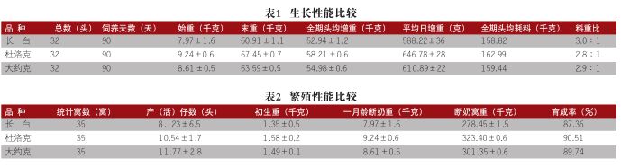 2.繁殖性能。从表2可见,杜洛克、长白、大约克三个品种的产(活)仔数分别为10.54±1.7头、8.23±6.5头、11.77±2.8头,杜洛克和大约克分别比长白多2.31头、3.54头,差异显著(p<0.05),而杜洛克与大约克差异不显著(p>0.05)。初生重杜洛克、长白、大约克分别为1.35±0.5千克、1.49±0.1千克、1.58±0.2千克,差异不显著(p>0.05)。一月龄断奶重杜洛克、长白、大约克三个品种分别为:9.24±0.6千克、7.97±1.6千克、8.61±0.5千克,差异不显著(p>0.05)。杜洛克、长白、大约克的育成率分别为90.51%、87.36%、89.74%,差异不显著(p>0.05)。