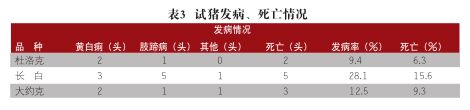3.抗病力与适应性。从表3可见,杜洛克、长白、大约克三个品种猪患黄白痢的分别为2头、3头、2头;患肢蹄病的分别为1头、5头、1头,杜洛克和大约克均比长白少4头;其他病的患病分别为0头、1头、1头;死亡头数分别为2头、5头、3头;发病率分别为9.4%、28.1%、12.5%差异显著(p<0.05);死亡率分别为6.3%、15.6%、9.3%,长白比杜洛克和大约克分别高9.3个百分点、6.3个百分点,差异显著(p<0.05),杜洛克和大约克差异不显著(p>0.05)。