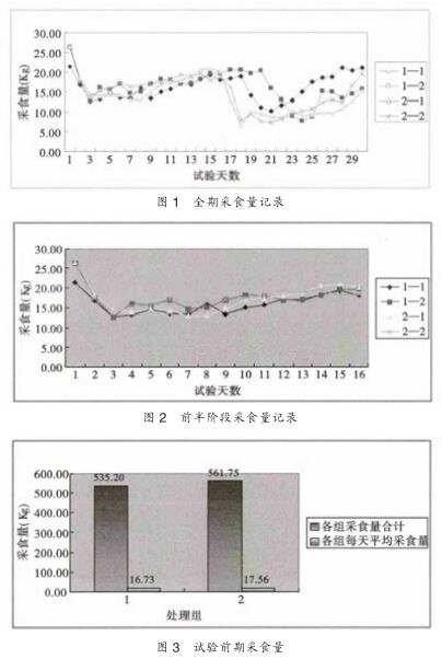 由图2可见,各个处理组的采食量趋势基本相同,且相对健康,因此可作一比较。在试验前期中,试验组的总采食量和平均每天采食量都高于试验组4.96%(见图3)。