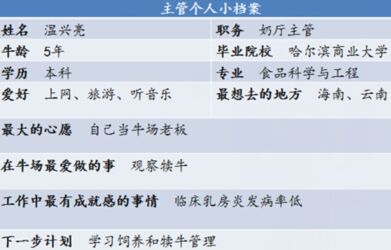 2012年,我进入黑龙江八一农垦大学成人教育进修2年动医专业。通过自身的努力和专业水平的提升,毕业后通过父母与牛场老板熟悉认识,我便来到了山东屯牧场工作。目前奶牛行业比较缺少专业技术人才,作为一名90后,我感觉到养牛行业枯燥乏味,但是由于自身比较喜欢这个行业,为了自己的理想把奶牛养好,就要持之以恒,坚持下去,要努力踏实的工作。
