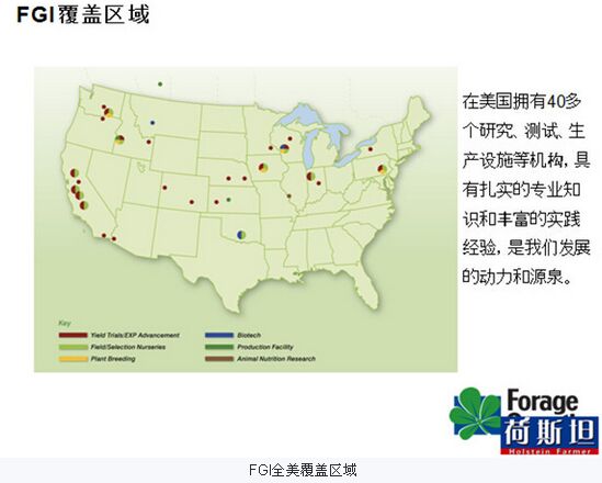 FGI在全球7个国家(中国、澳大利亚、匈牙利、墨西哥、阿根廷、美国、加拿大)拥有种子研发中心和生产基地,在全美育种中心超过35个,有40多个研究、测试、生产设施等机构;在中国拥有17个试验及研发基地,通过在全球多个地区多年来进行数据测试和收集来完成多样化紫花苜蓿育种计划,拥有很多秋眠级从2到11级的优良品种,能充分满足世界不同地区客户的需求;合作伙伴包括孟山都、先正达、诺贝尔基金。