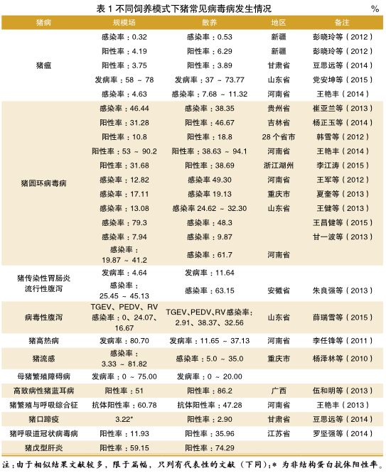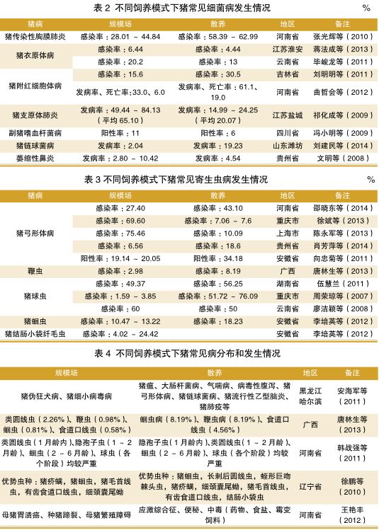 近年来我国部分地区不同饲养模式下猪常见病发生情况见表1、表2、表3。