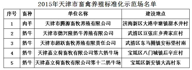 天津市2015年畜禽养殖标准化示范场名单的公示