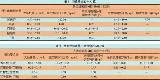 表1和2概述了所选精油和精油复合物对多种微生物的 MIC。在不考虑饲料在动物肠道中被进一步稀释的情况下,MIC给出了植物源性复合物在动物体内的真实杀菌作用不能利用植物源性添加剂获得的证据。饲料中能发挥杀菌作用的精油浓度将会: