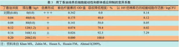 这种所谓的群体感应抑制 (Quorum Sensing Inhibition,QSI),已在模型微生物青紫色素杆菌 (Chromobacterium violaceum) 上得到了充分的研究,在达到临界群落密度时该菌可以产生紫色荧光色素。因此,青紫色素杆菌可用作一种检测所选物质QSI能力的筛选工具。然而,为了分析QSI对致病微生物的影响,还需要其他参数。研究表明,在植物源性物质的QSI范围内,丁香油在亚抑菌浓度已经能够强烈地抑制青紫色素杆菌中的紫色杆菌素荧光(表3)。已有研究报道,精油对空肠弯曲杆菌和肠出血性大肠杆菌 OI57:H7的QSI也获得了可喜的成果。