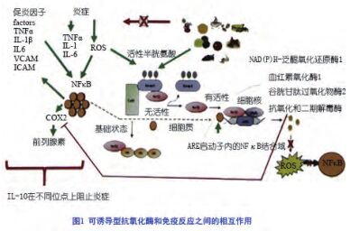 内源性抗氧化酶对中止炎症特别重要,它们是NAD(P)H-泛醌氧化还原酶1(NQO1)、血红素氧化酶1(HO1)和谷胱甘肽过氧化物酶2(GPx2)。这些被提到的抗氧化酶有一个共同的特点在于其特殊的合成机制。