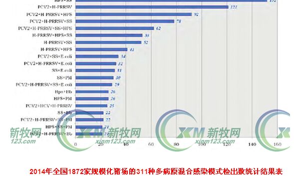 “链球菌主要流行的还是2 型,其他的血型没有这么严重,副猪嗜血杆菌主要是4、5型。”陈焕春介绍,2014年,根据全国1872家规模化猪场的311种多病原混合感染模式检出数统计,混合感染最高的为副猪嗜血杆菌+ 链球菌,其次就是圆环+ 蓝耳+ 副猪嗜血杆菌和圆环+ 蓝耳+ 链球菌。