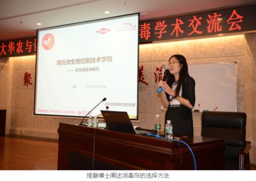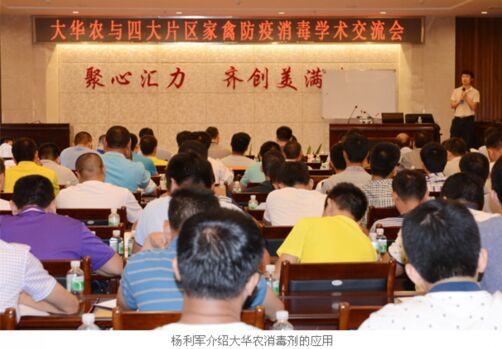 姬静博士介绍了陶氏化学的发展历程,并就如何选择消毒剂进行了详细阐述,分析了市面现有的氯类、季铵盐类、碘类等各种消毒剂的作用机理,并对陶氏化学的消毒产品格利特做了具体介绍,特别讲解了该产品的广谱、高效与环保的特点。此外,大华农动保厂市场部副主任杨利军也向与会人员介绍了大华农先进的消毒剂生产线,严格的生产流程以及施特爽、菌毒灭等一批高效消毒剂产品。(陈林彬)