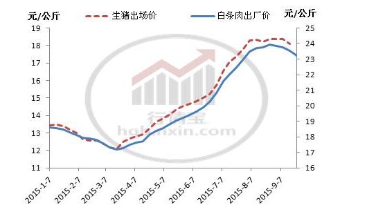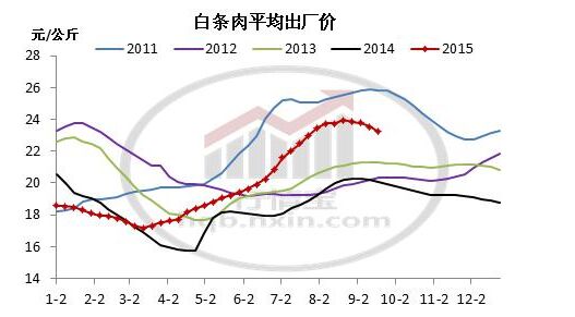 进入9月后,白条肉出厂价与生猪价格一起持续小幅下跌。鲜销不畅促使屠企减少采购量。猪价下调后,养殖户的相继恐慌集中出栏,给屠企造成进一步压价的空间,使猪价从9月份第二周开始直线下跌。