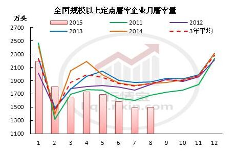 农业部公布的2015年8月全国规模以上定点屠宰企业屠宰量显示,8月份规模以上定点屠宰企业屠宰量为1500.3万头,环比增加0.56%,同比减少19.0%。8月份屠宰量微增符合我们月初月报的预估。