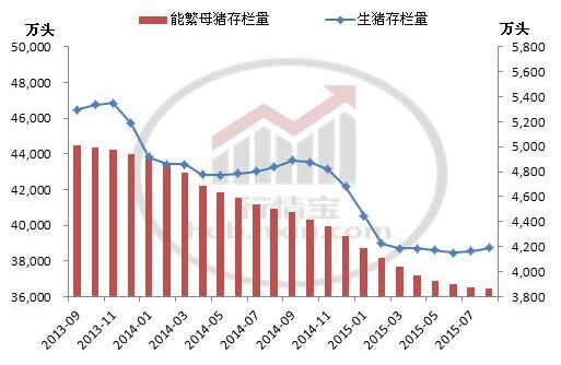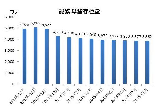 农业部公布的2015年8月存栏数据显示,能繁母猪存栏8月环比下跌0.4%,同比减少14.2%。行情宝测算,8月相比上个月能繁母猪减少约16万头。能繁母猪已连续24个月环比减少。