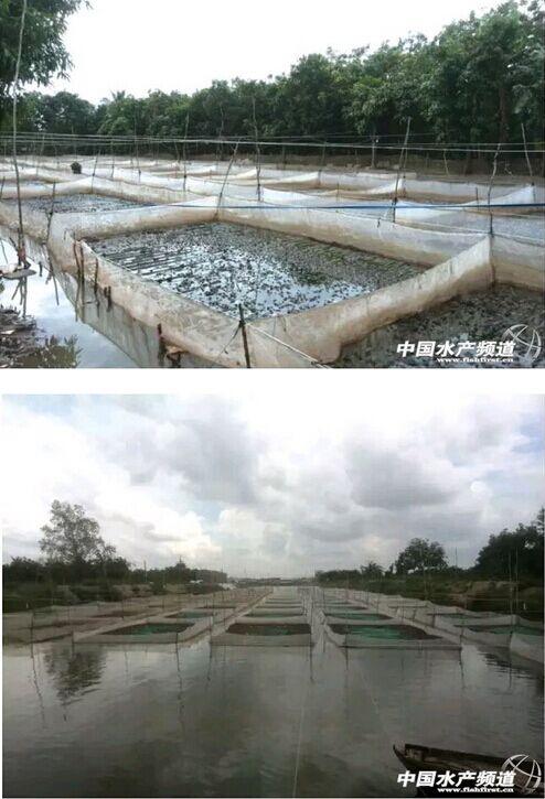 陆地上的薄膜池养殖和池塘网箱养殖比较普遍,但以池塘网箱养殖为主。池塘面积一般在2000m2以上,利用其中1/2-2/3的面积挂设数量不等的网箱,网箱规格一般为4m×10m×2m,网箱周围四边用网孔较小的网衣,防止饲料漂到网箱外面,底部用较粗的网衣,利于蛙粪便落入网箱外,网箱内铺设竹排,竹排没入水面约3-5cm。同时,由于越南南部阳光比较强烈,养殖户一般会在网箱上面搭设遮阳网,防止强光对蛙的直射。