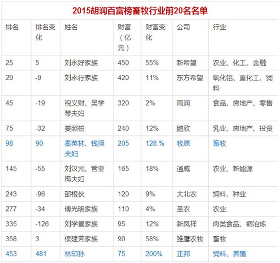 中国2015胡润百富榜公布 畜牧业富豪20名上榜