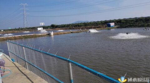 门前的海鲈塘,增氧设备配备充足