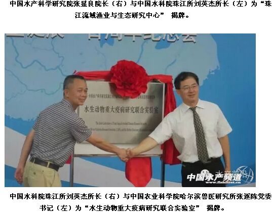 接着是相关管理与科研平台揭牌仪式,由农业部长江流域渔政监督管理办公室处长赵依民宣读农业部长江办《关于将珠江流域渔业管理委员会办公室挂靠珠江水产研究所的函》,并与刘英杰副院长、所长共同为该办公室揭牌。该办公室主要负责流域内渔业资源和环境的监测、水生生物资源养护、生态修复、涉渔工程环评等工作并负责办公室的日常工作。珠江所位于珠江流域的核心地段,作为国家级的流域性研究院所,不仅可以提供强有力的技术支撑,而且具有较强的辐射和带动能力。该办公室挂靠在珠江所有助于推动珠江流域的渔业渔政管理,对保障渔业的可持续发展以及实现“美丽中国”梦想都具有重要而深远的意义。中国水产科学研究院为加强珠江流域科研力量的合作交流,也将“珠江流域渔业与生态研究中心”挂靠珠江所。除此之外,珠江所与中国农业科学研究院哈尔滨兽医研究所为进一步提升我国水生动物疫病防治水平,共建“水生动物重大疾病研究联合实验室”。