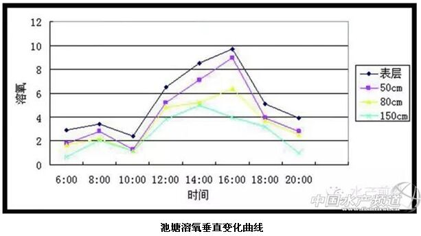 由于水中辐照度和浮游植物均有垂直梯度变化,白天上层辐照度大,浮游植物多,光合作用产氧多,溶氧量可达l0mg/L左右。下层正好相反,产氧少而耗氧量大,加之白天由于水的热阻力,上下水层不易对流。在没有人工增氧的池塘中,溶氧在水中的分布呈现出从上到下垂直递减状态。