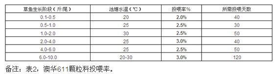 投喂率:根据天气、水质、溶氧和鱼的吃食情况适当增减,一般日投喂率占鱼体重的1.0%~3.0%。新洲地区养殖模式中有套样鲫鱼和鲤鱼的习惯,澳华颗粒料611投喂率见表2。另外,湖北地区养殖季节分明,草鱼生长周期不尽相同,所以在不同的水温、不同生长阶段,草鱼对营养和饵料的需求有所差别,因此日投喂率有所不同。具体投喂率参考如下表2。