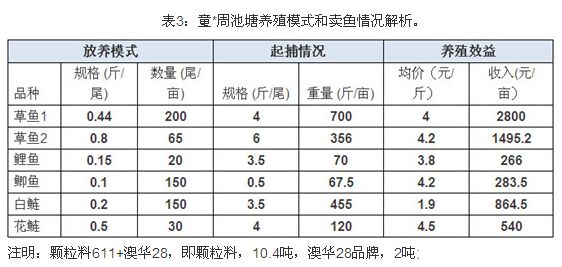 新洲养殖户童*周,全程使用澳华颗粒料(611)和澳华28两个品种的饲料,池塘面积15亩,水深1.8米;硬件配备:2台增氧机和1台投饵机。养殖期间饲料投喂和池塘管理全程按照澳华公司技术方案执行。养殖效益见表3。