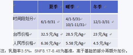 台湾实行冬季、暖季和夏季三段计价。因为冬季乳品消费量低,所以乳品厂将价格压得很低,让农民想办法把产量调到夏季。比如让奶牛春季分娩,泌乳高峰在夏季。此外,冬季乳品有滞销压力时,会启动收奶配额机制。
