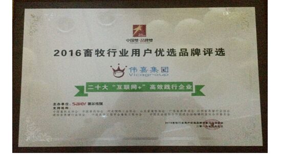 2016年9月5日,由赛尔传媒主办的“维科杯”2016第二届畜牧行业用户优选品牌评选颁奖盛典在北京石景山景园假日酒店隆重举办,中国畜牧业协会常务秘书长殷成文出席盛典活动并致开幕辞。伟嘉集团荣获畜牧行业“互联网+”高效践行企业20强。