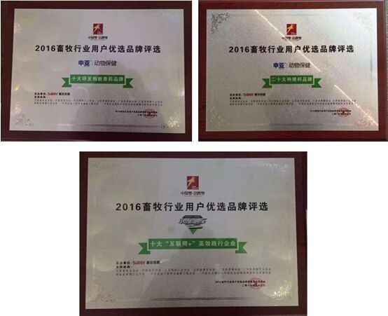 金秋时节,丹桂飘香,用心耕耘的申亚人再一次迎来了丰收的季节,在“中国梦·品牌梦”——2016年畜牧行业用户优选品牌评选活动中,申亚品牌获得了行业各界人士的肯定和赞誉。获得了“十大研发创新兽药品牌”、“十大互联网+高效践行企业”、“二十大种猪料品牌”三个重量级的奖项。