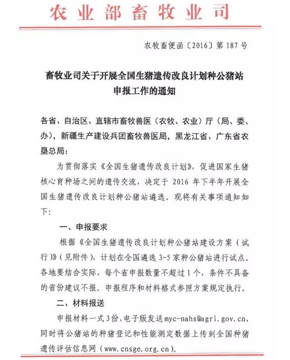 申请全国生猪遗传改良计划种公猪站的企业,需经3家国家生猪核心育种场推荐,并填写《全国生猪遗传改良计划种公猪站》申请表(见附件)。省级畜牧兽医行政主管部门审核签署意见后,报送全国畜牧总站牧业发展处。申报材料一式3份,电子版材料传至myc-nahs@agri.gov.cn。