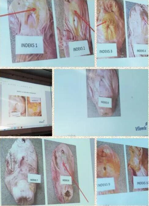 3、重视胃的健康:建议合理调整饲料粉碎粒度:粒度<1mm 不高于20%,粒度1-2mm<30%,粒度大于>2mm应该在50%以上。通过胃幽门处的病变程度看胃是否建康,他们PSY达35以上的胃均是十分健康,评分在0-1之间(见图)。重视纤维营养,建议用粉料,蛋白偏高对胃的健康也不利。若用颗粒料时,胃的受损加剧,从7.9%提高到23.2%;