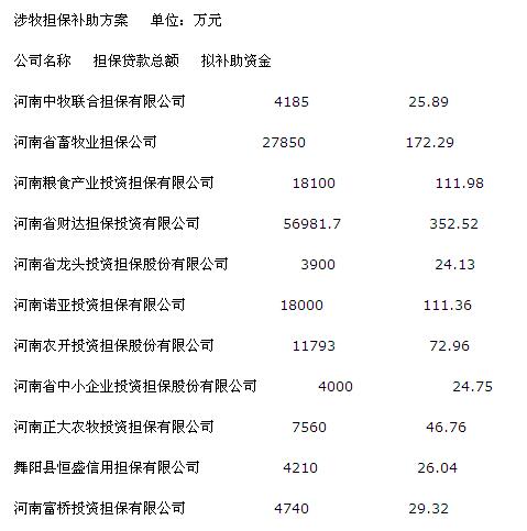 据了解,河南中牧联合担保有限公司、河南省畜牧业担保公司等11家涉牧担保公司,今年担保贷款共计161319.70万元。经其自主申报,有关省辖市、省财政直管县畜牧部门审查,省畜牧局组织专家审核,我省根据《河南省2016年畜禽标准化养殖项目实施方案》相关规定,拟对各涉牧担保公司予以相应的资金补助。对补助方案有异议的,可于2016年12月14日至2016年12月23日予以举报,举报电话:0371—65778857、65778865。