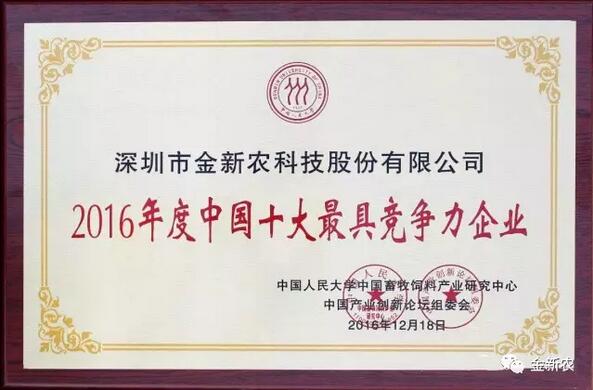 热烈庆祝金新农荣获“2016年度中国十大最具竞争力企业”荣誉称号