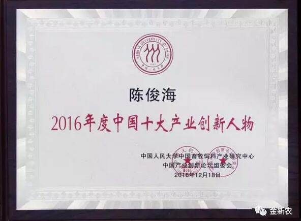 深圳市金新农科技股份有限公司喜获“2016年度中国十大最具竞争力企业”荣誉称号,公司董事长陈俊海博士获颁“2016年度中国十大产业创新人物”奖项。
