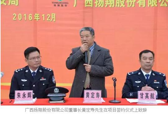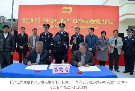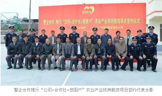 12月23日上午,贵港市公安局和广西扬翔股份有限公司在港南区木格镇东坡村举行警企合作,推行“公司+合作社+贫困户”农业产业扶持脱贫项目签约仪式。贵港市人民政府副市长、市公安局局长朱永辉,市财政局、市扶贫办、港南区政府、市农发行等相关部门领导及广西扬翔股份有限公司董事长黄定寿先生参加了签字仪式。