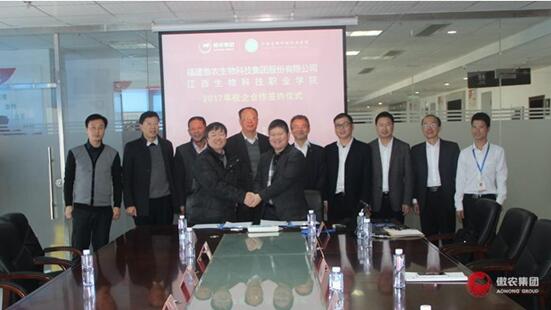 12月29日,集团与江西生物科技职业学院2017年校企合作签约仪式在总部会议室顺利举行。江西生物科技职业学院党委委员·副院长朱吉生、招生就业办主任龚金荣、教务处长李军民、动物科学系副书记·副主任欧阳清芳、傲农班班主任胡善辉等校方领导,集团董事长吴有林,集团养猪产业总裁·研究院院长丁能水,集团副总裁黄华栋、刘勇、叶俊标,人力资源中心总经理陈建平等出席签约仪式。