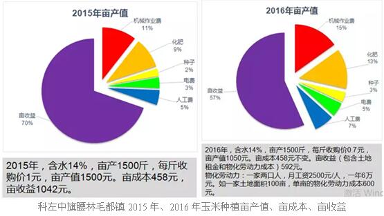 按照内蒙古通辽市科左中旗(种养加试点之一)2015、2016年玉米种植亩产值、亩成本及亩收益计算:2015年玉米含水量14%,亩产1500斤,每斤收购价1元,亩产值1500元,其中亩成本458元,亩收益1042元。2016年,含水14%,亩产1500斤,每斤收购价0.7元,亩产值1050元,亩成本458元不变,亩收益(包含土地租金和物化劳动力成本)592元。